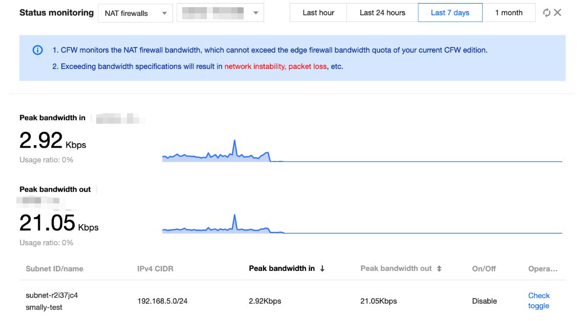 2. 在防火墙状态监控页面,可实时查看并监控基于 NAT 边界的带宽情况,可避免因 NAT 边界防火墙带宽超出规格而带来网络丢包和波动,从而及时作出扩容或关闭部分开关等调整。