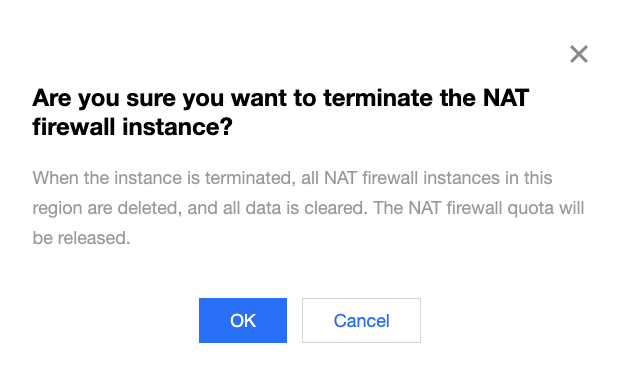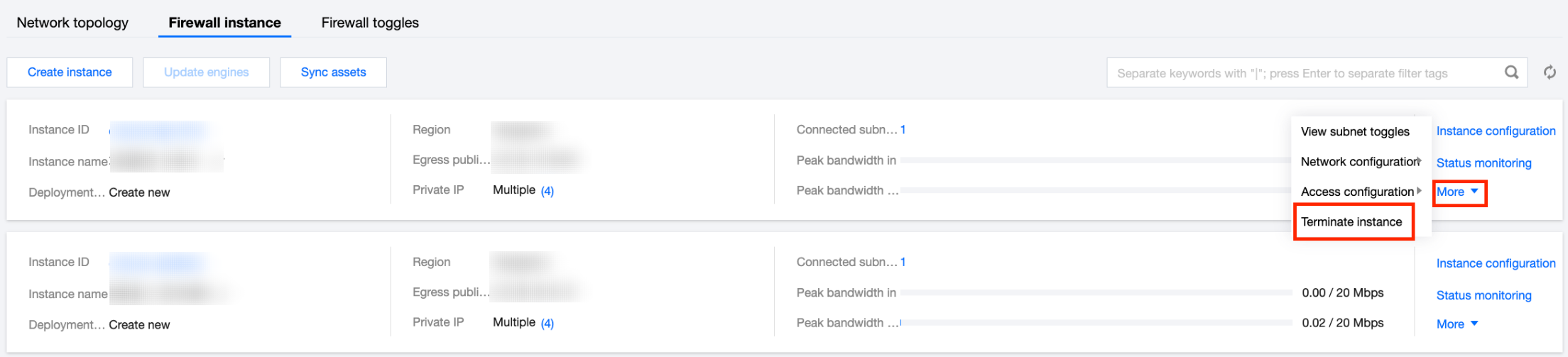 1. 在 NAT 边界开关 > 防火墙实例页面,单击更多,在下拉框中,单击销毁实例。 注意: