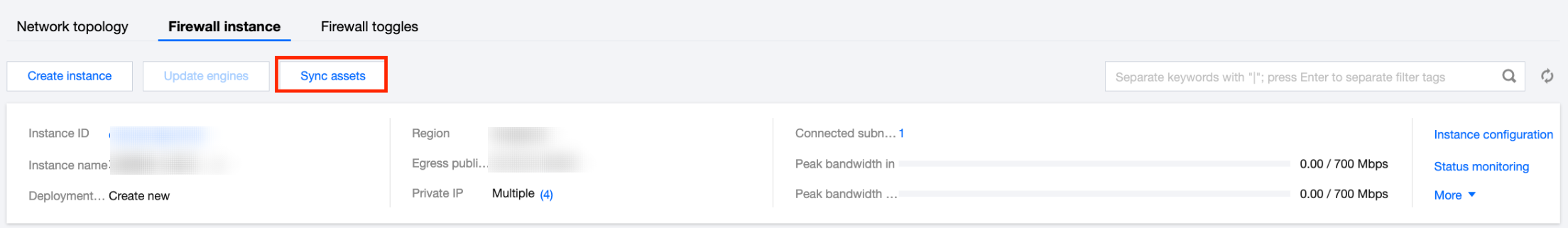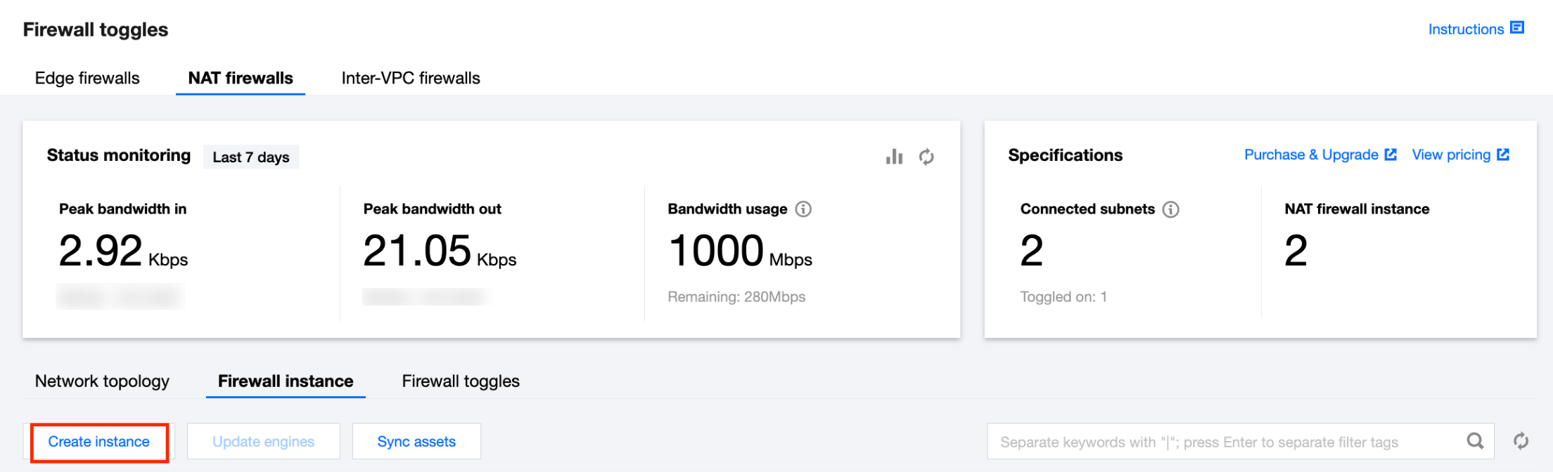 2. 在 “NAT 边界开关”页面,可进行创建实例、同步资产、查看并监控基于 NAT 边界的带宽情况等操作。
