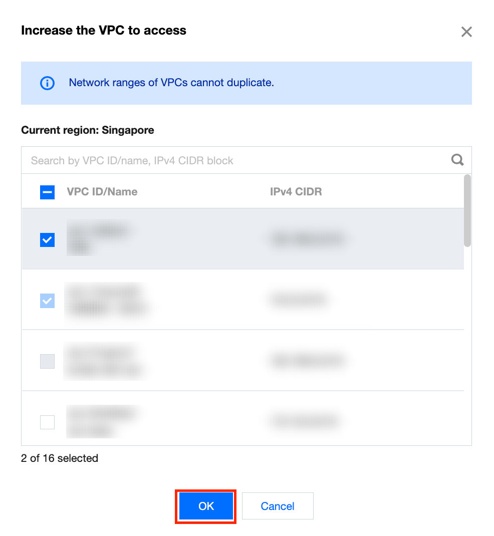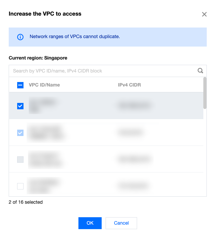 单击增加接入 VPC,选择需要增加接入的VPC,单击确定。