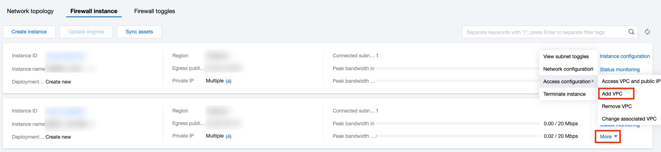 1.1 在 NAT 边界开关 > 防火墙实例页面,单击更多,在下拉框中,单击增加接入 VPC。 1.2 在增加需要接入的 VPC 弹框中,选择需要的 VPC,单击确定,即可配置完成。