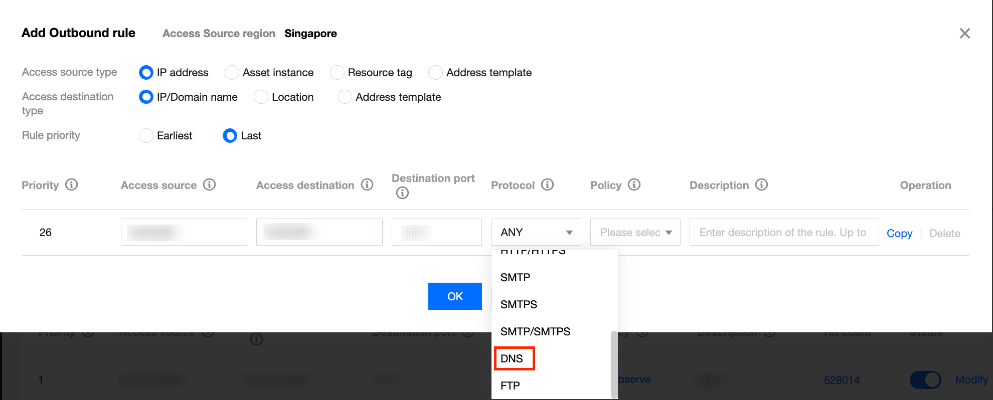 1.3 在添加规则页面,填写相关字段,并选择 DNS 协议。