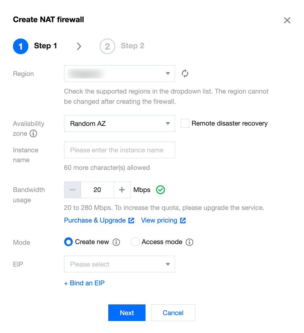 2. 在“新建 NAT 边界防火墙”弹窗中,可为当前账号创建一个新的 NAT 边界防火墙实例,填写相关字段,单击下一步。