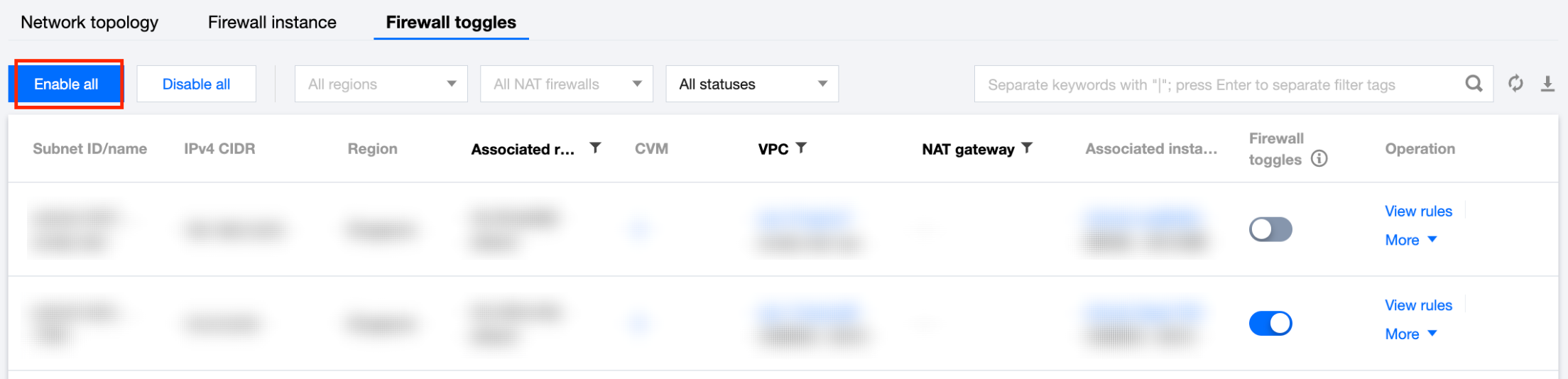 2. 单击某个 VPC 节点,可查看对应子网列表,可以只针对当前子网开启或关闭防火墙开关。