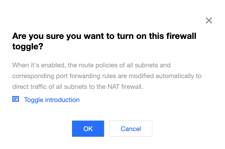 开启开关后,系统会自动修改子网关联路由表的路由策略,以及子网对应的端口转发规则,该子网的流量牵引至 NAT 边界防火墙。