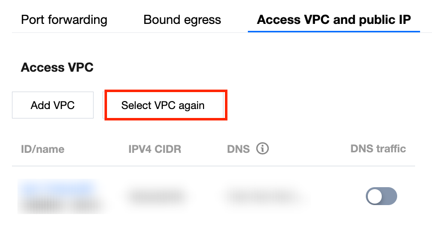 在实例配置页面的接入 VPC 与公网 IP 页签下,可以增加接入的 VPC 或者重新选择 VPC。