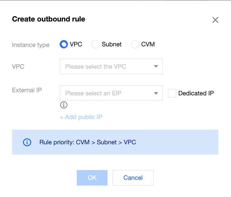 协议可选子网和私有网络,VPC 或子网的选项选择接入 NAT 边界防火墙,且当前没有绑定出口 NAT 规则的 VPC 或子网。