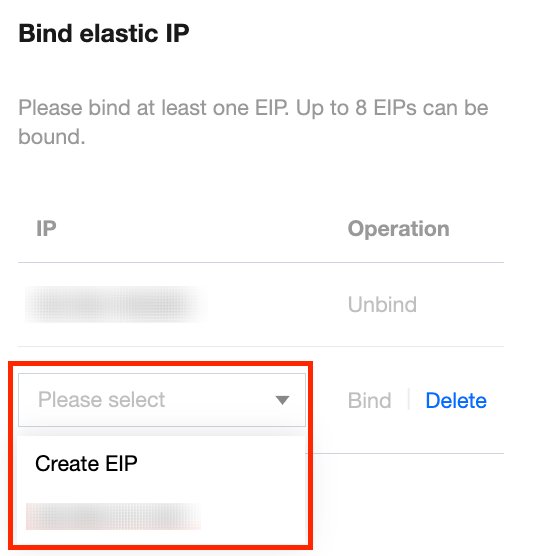 弹性 IP:若选择新建弹性 IP,系统会自动为用户申请一个弹性 IP,用户也可从所有闲置的弹性 IP 中选择一个进行绑定。