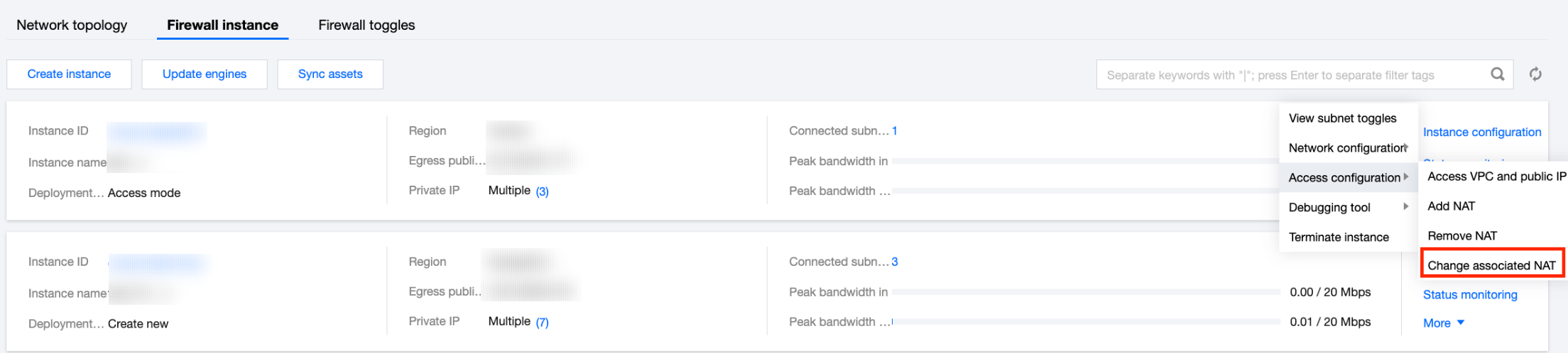 1.1 在 NAT 边界开关 > 防火墙实例页面,单击更多,在下拉框中,单击重新选择接入 NAT。 注意: