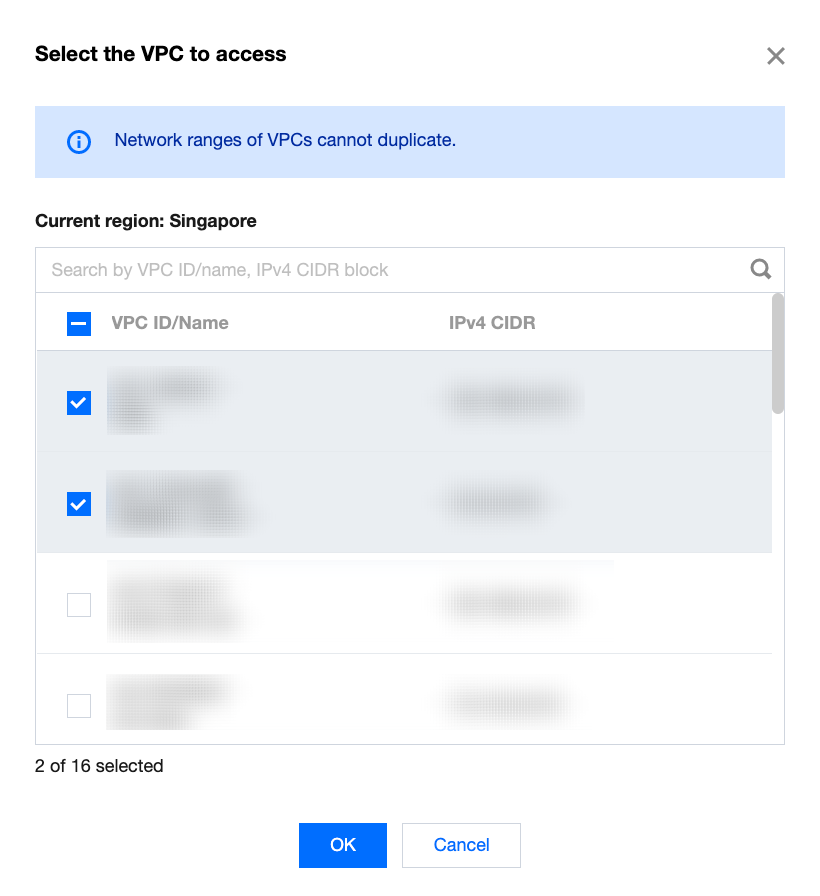 复选框:默认已点选用户当前 VPC,已选择的 VPC 无法取消。