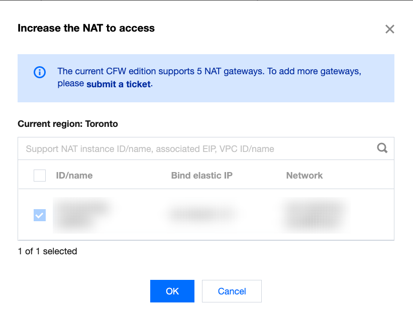 单击选择需要接入的 NAT后,即触发当前地域下 NAT 边界防火墙开关锁,直至重新选择完毕,单击确定后解锁。在开关锁期间,若有当前地域其他用户有开启开关请求,会提示有其他用户正在重新接入 NAT,开关被锁定,请稍后重试。