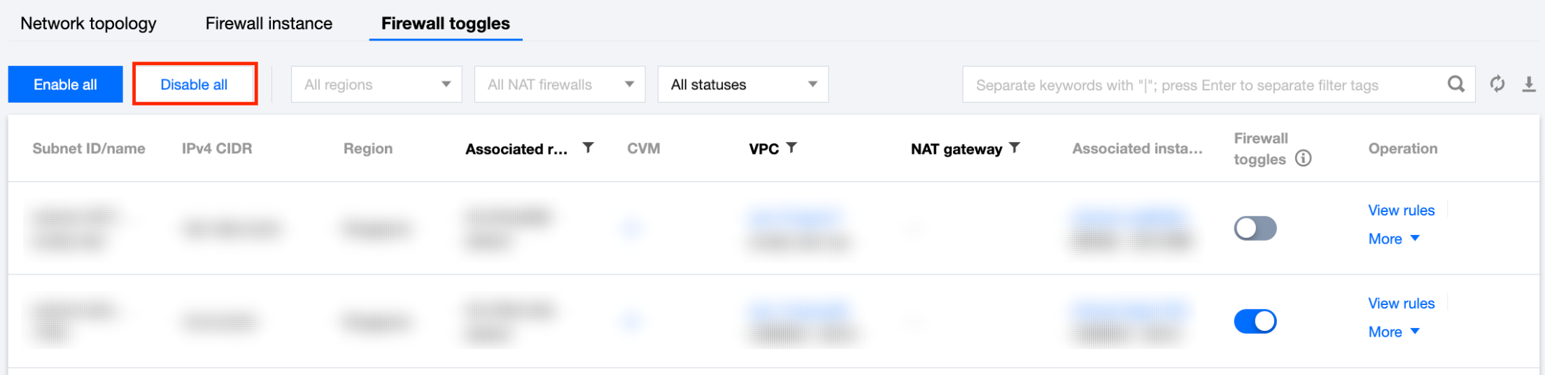方式1:在实例列表上方,单击关闭防护,所有已开启的 NAT 边界防火墙开关将被关闭,NAT 边界防火墙会自动关闭下一跳类型为 NAT 边界防火墙的所有路由表的路由策略,所有子网将断开与互联网的连接,用户需要在 私有网络控制台 手动启动新的路由策略。 说明: