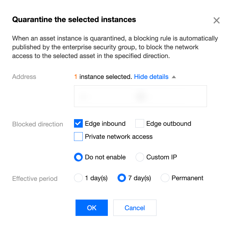 隔离:单击隔离,资产实例隔离会自动下发企业安全组阻断规则,拦截选中资产的指定方向的网络访问,便于后续的定位排查,及时止损。