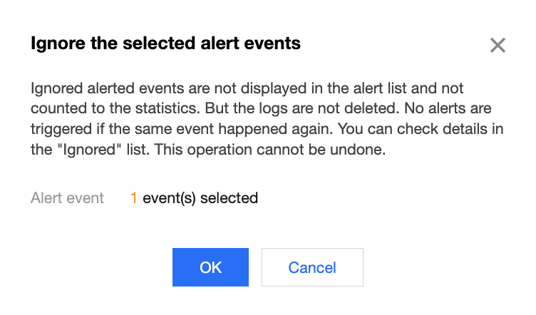 忽略:针对告警中存在重复或可能的误报,可以单击忽略,被忽略的告警事件将不会出现在告警列表和统计中,但不会删除日志。若该事件再次触发告警均不会显示,您可以在列表中选择已忽略来查看被忽略的所有事件,忽略操作不支持撤销,建议谨慎操作。