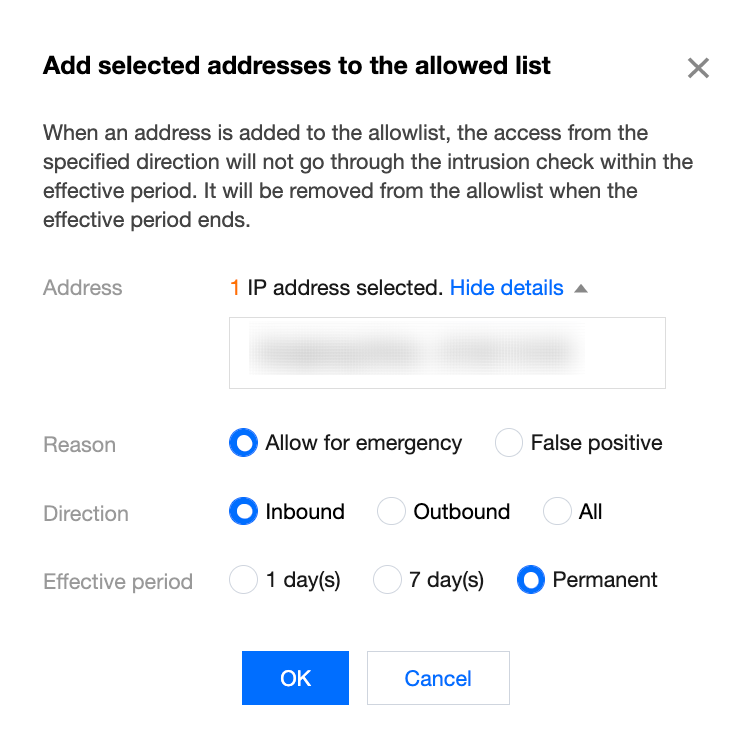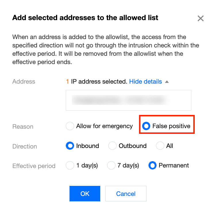 放通:对于用户任务不应拦截的 IP,可单击放通,选择放通原因、方向和生效时间提交即可。在选定时间内,该 IP 会被加入 入侵防御 模块的放通列表(白名单),云防火墙会在一定时间范围内,将该 IP 地址绕过入侵防御模块检测,从而放行该 IP 地址的流量。如果用户不确定放通原因是否为:误报 ,可优先选择紧急放通,待确定后修改即可。