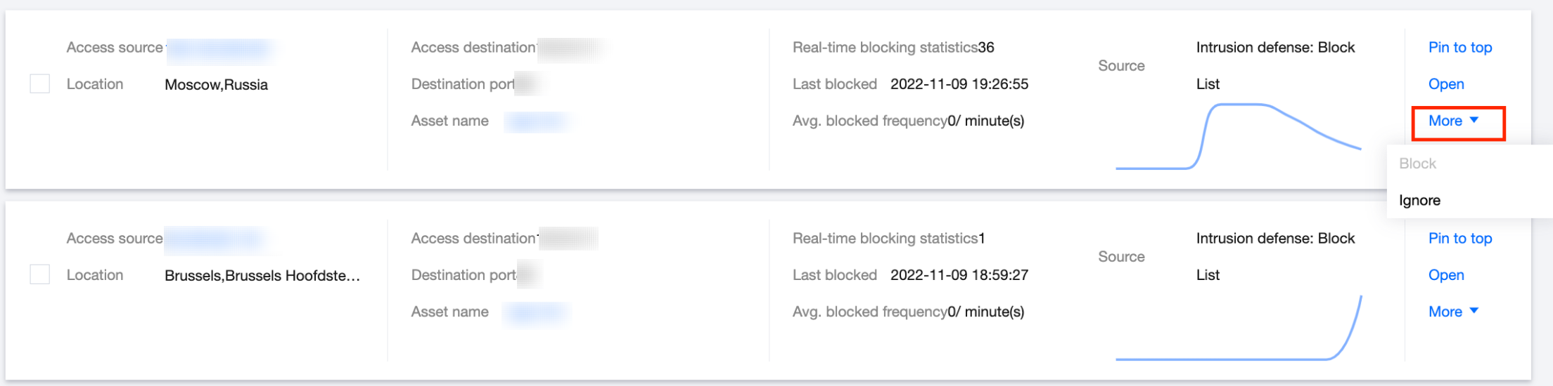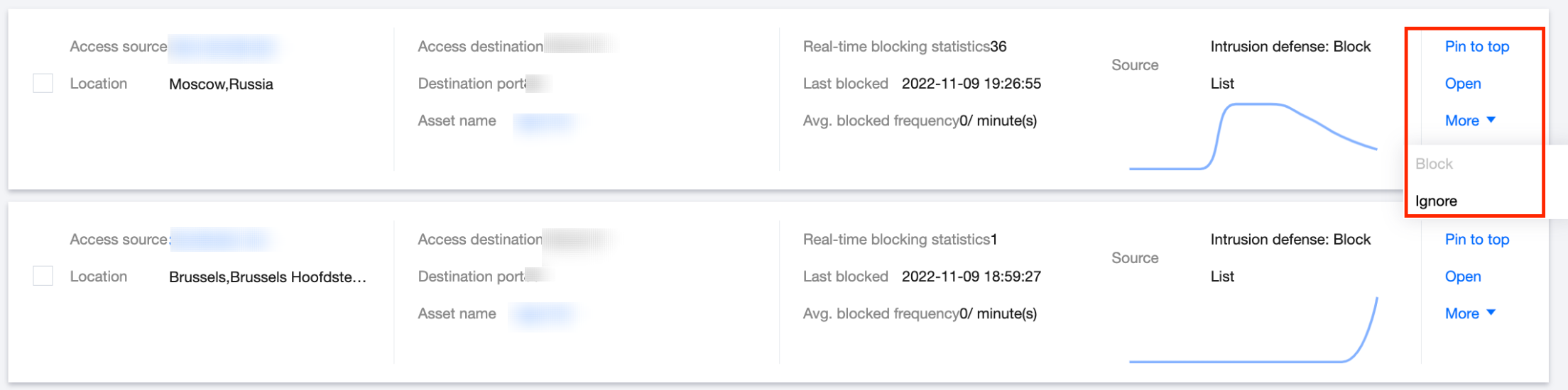 对于入站方向已封禁的访问源 IP,可以选择置顶或者放通;对于已放通的访问源 IP 可以单击更多再次进行封禁。