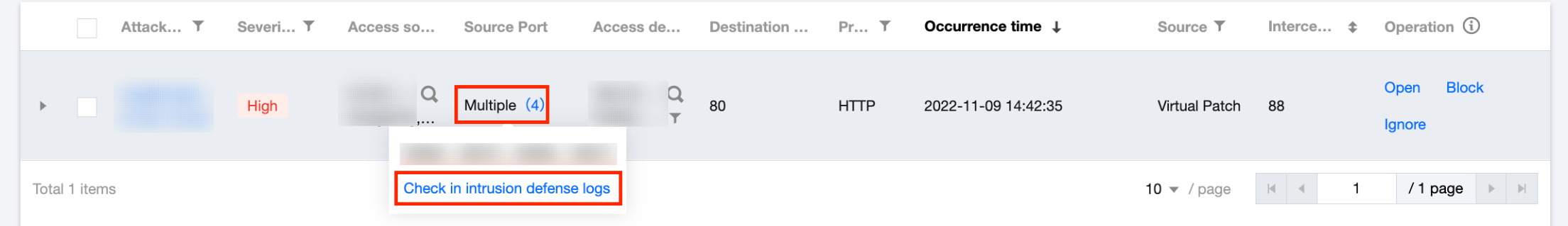 您可以在资产视角下,将鼠标悬浮在访问目的/访问源资产名称上,单击下方的在入侵防御日志中查看查询所有攻击事件。