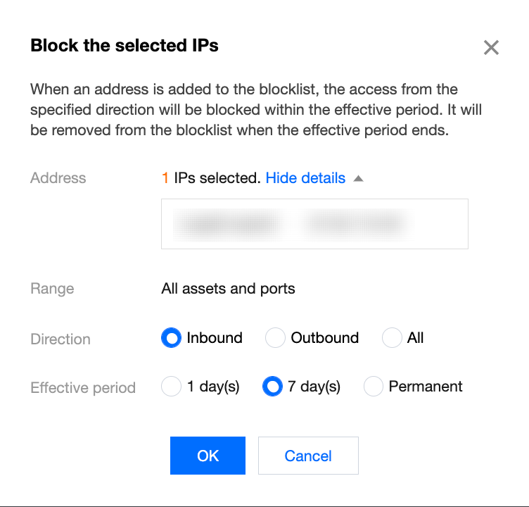 封禁:针对危险等级较高的资产,可以单击拦截,选定方向和生效时间后,将该 IP 地址添加至 入侵防御 模块的封禁列表(黑名单),云防火墙会选定时间范围内,自动拦截该 IP 地址对用户全部资产的访问。