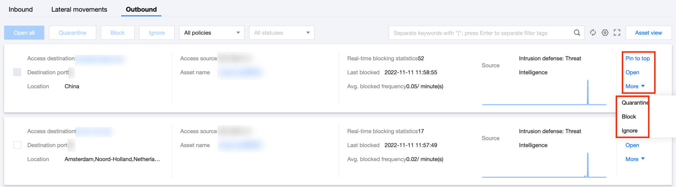 对于出站方向被入侵防御模块拦截的资产/IP,可以选择置顶、放通、隔离、封禁或者忽略。