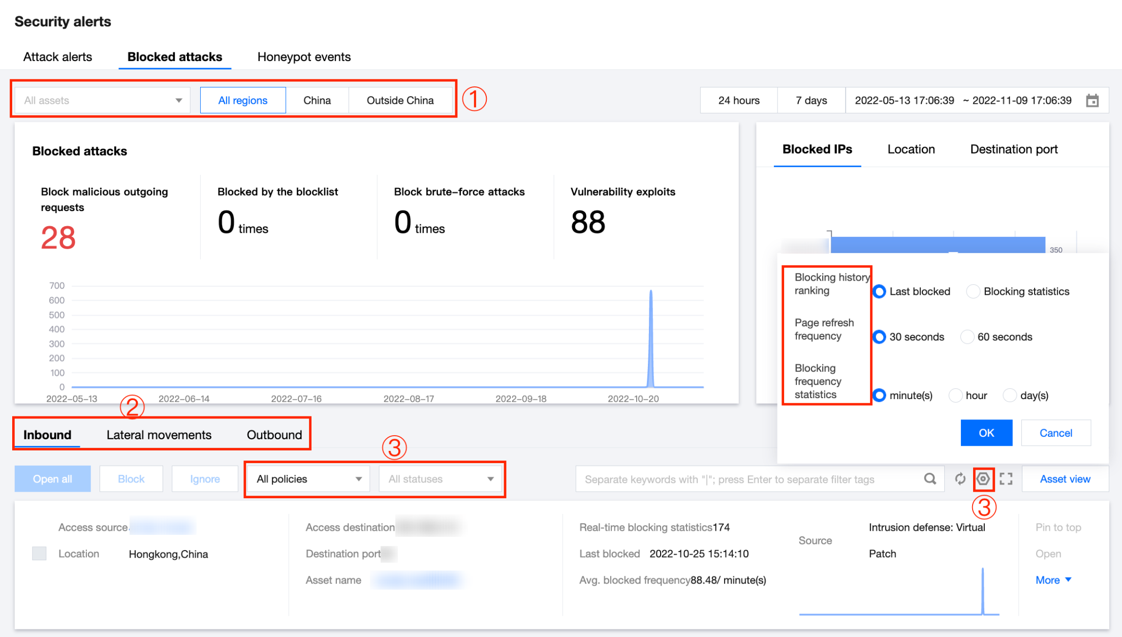 本节将指导您快速筛选定位您想要的拦截信息。 ①选定想查看的资产和地域。 ②选定入站方向、横向移动或出站方向。 ③选定入侵防御策略和处置状态,您可以根据拦截记录排序、页面刷新效率和拦截频率统计等模块进行筛选。