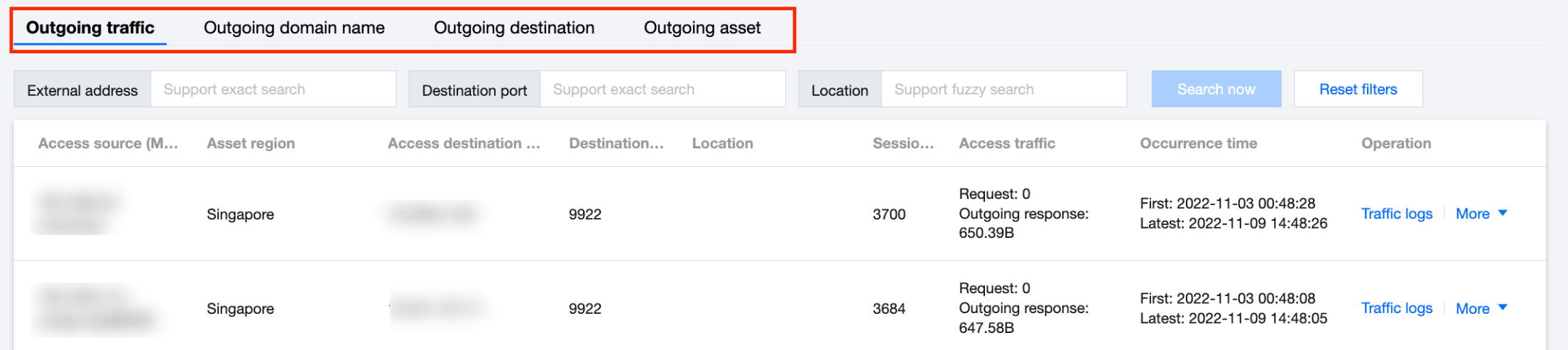 2. 您可以在下方的列表中,查看对应的外联流量、外联域名、外联地址和外联资产的访问情况,其中,外联域名、外联地址和外联资产均支持查看详情。