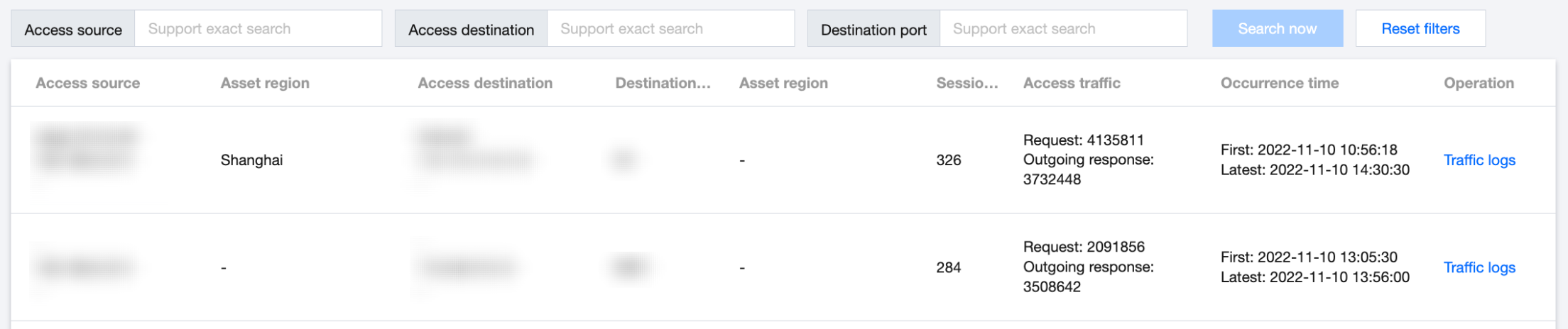 2.1.2 在流量日志页面,可查看指定 IP 之间的访问详情,并以访问源和访问目的作为筛选条件,呈现同一访问源访问同一资产的具体信息。
