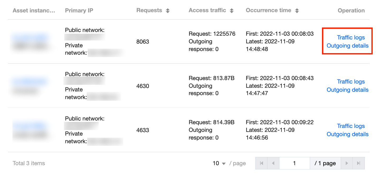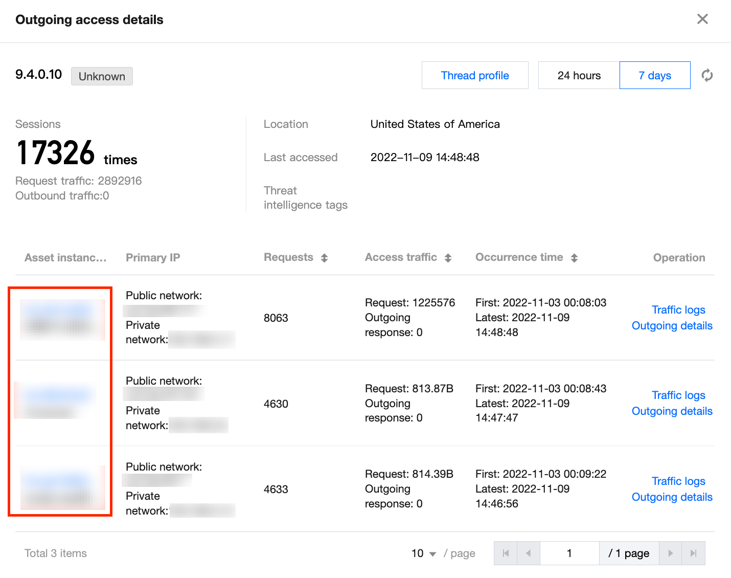 5. 如需进一步了解列表中某一资产的外联情况,可在实例列表右侧操作栏,单击流量日志或外联详情,可查看对应流量日志或某个特定资产在近7天或24小时内外联的 IP 和域名。