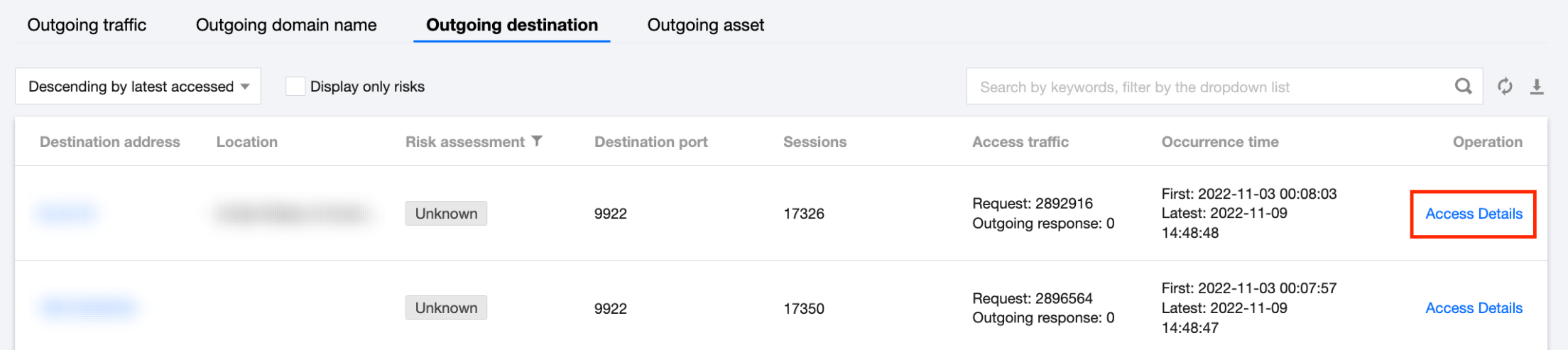 3. 以外联地址为例进行说明,其他模块查看方式相同。单击外联地址,在目的 IP 右侧操作栏,单击访问详情,进入主动外联详情页面。