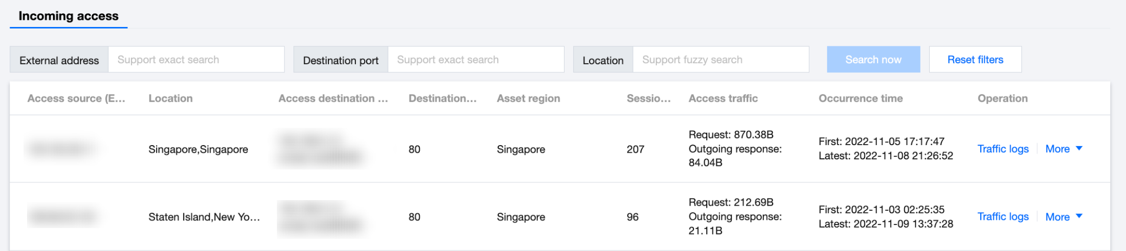 1. 在“外部访问”列表的“外部地址”搜索栏中,输入访问源精确 IP 地址、在“目的端口”的搜索框中,输入资产精确 IP 地址、或在“地理位置”搜索栏,输入精确或模糊地名,然后单击开始搜索,查询流量相关访问情况。