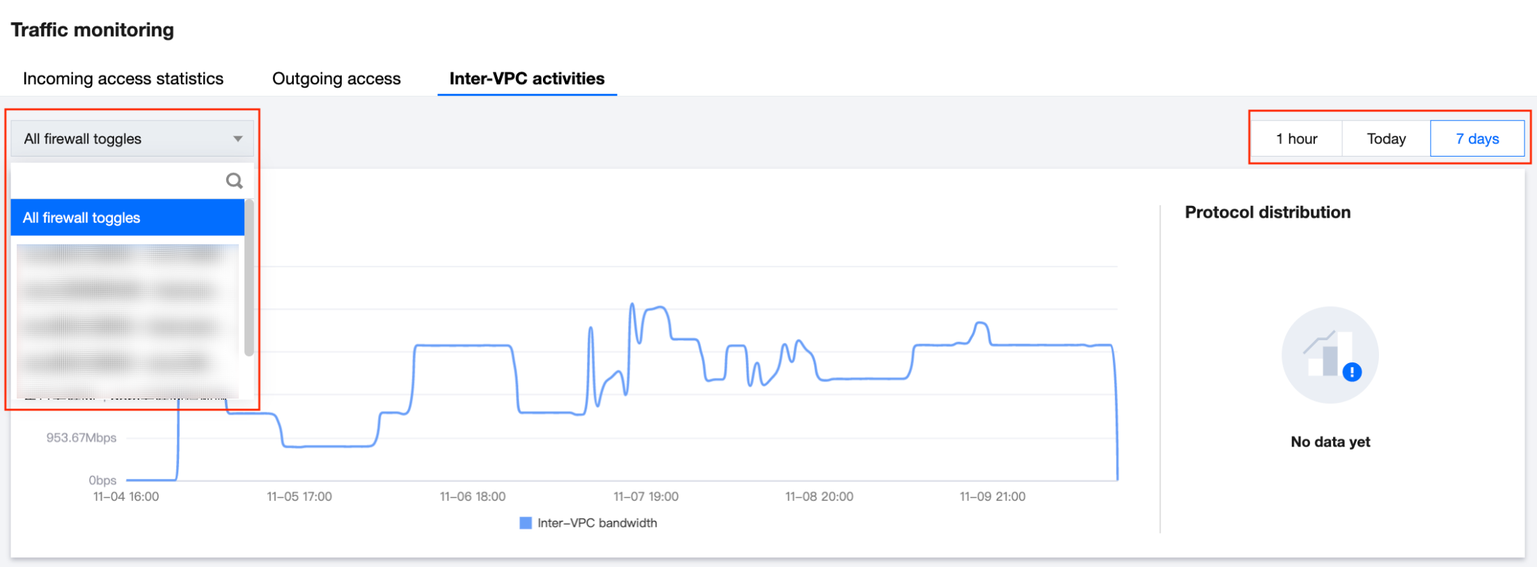 1. 登录 云防火墙控制台,在左侧导航栏中,单击流量中心并进入“VPC 间活动”页签中。 2. 在“VPC 间活动”页签的上方筛选框中,选择具体私有云的实例,并选择需要查看的时间段。