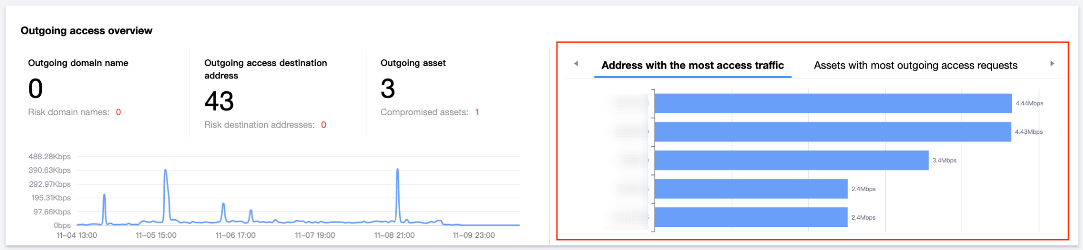 1. 登录 云防火墙控制台,在左侧导航栏中,单击流量中心并进入“主动外联分析”页面。 在“主动外联概况”模块,可查看“7天”或“24小时内”出向流量的访问情况,同时用户可以筛选时间和资产,来查看具体资产在某个时间段内的外部访问统计。