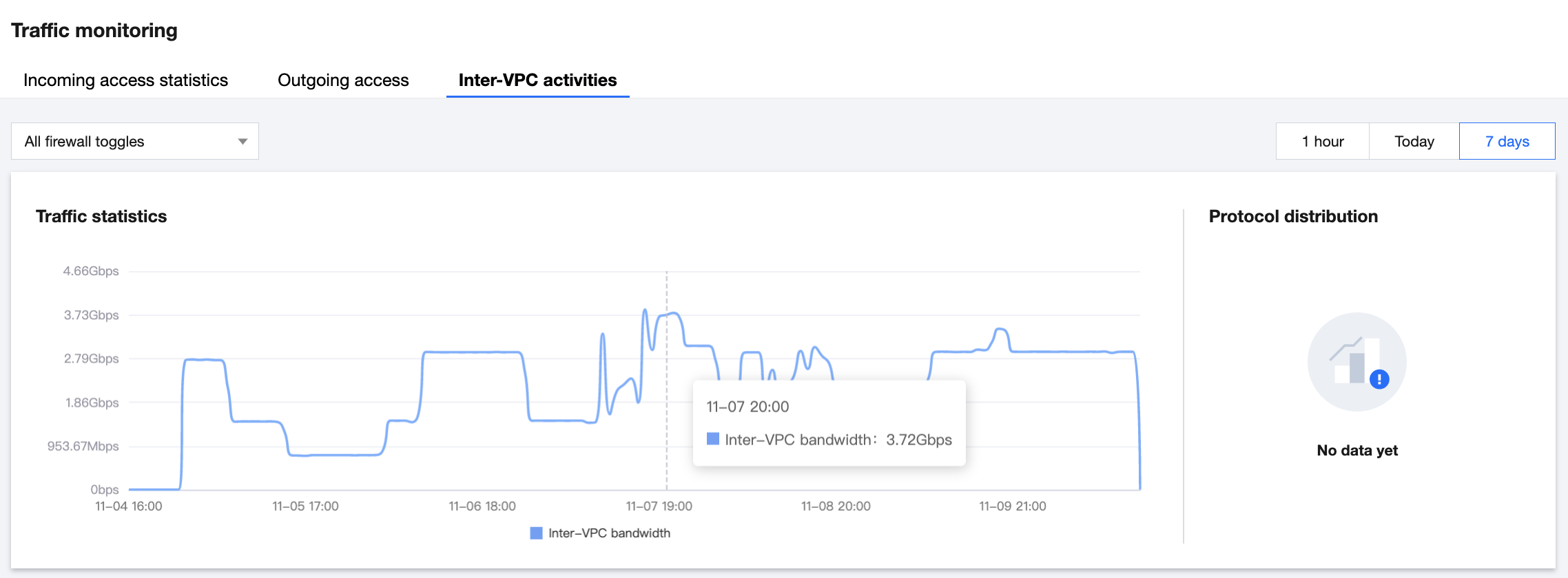 您可以在 VPC 间活动页面,查看私有云之间的流量访问情况和协议分布。