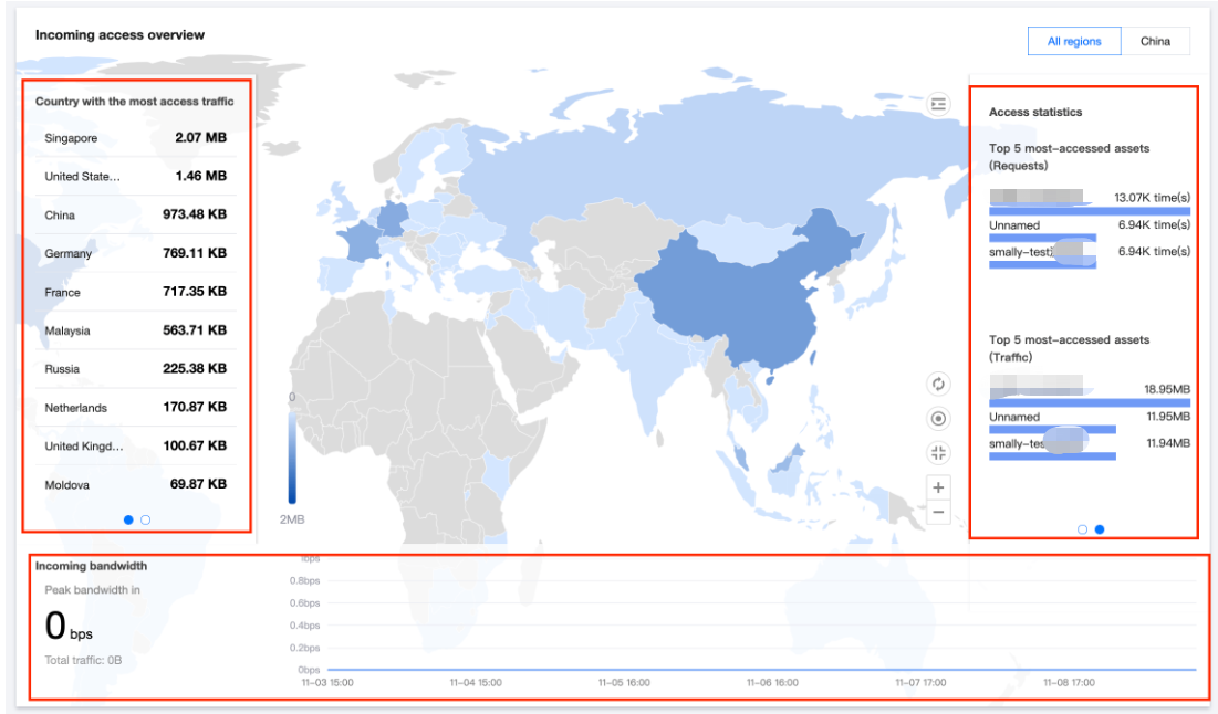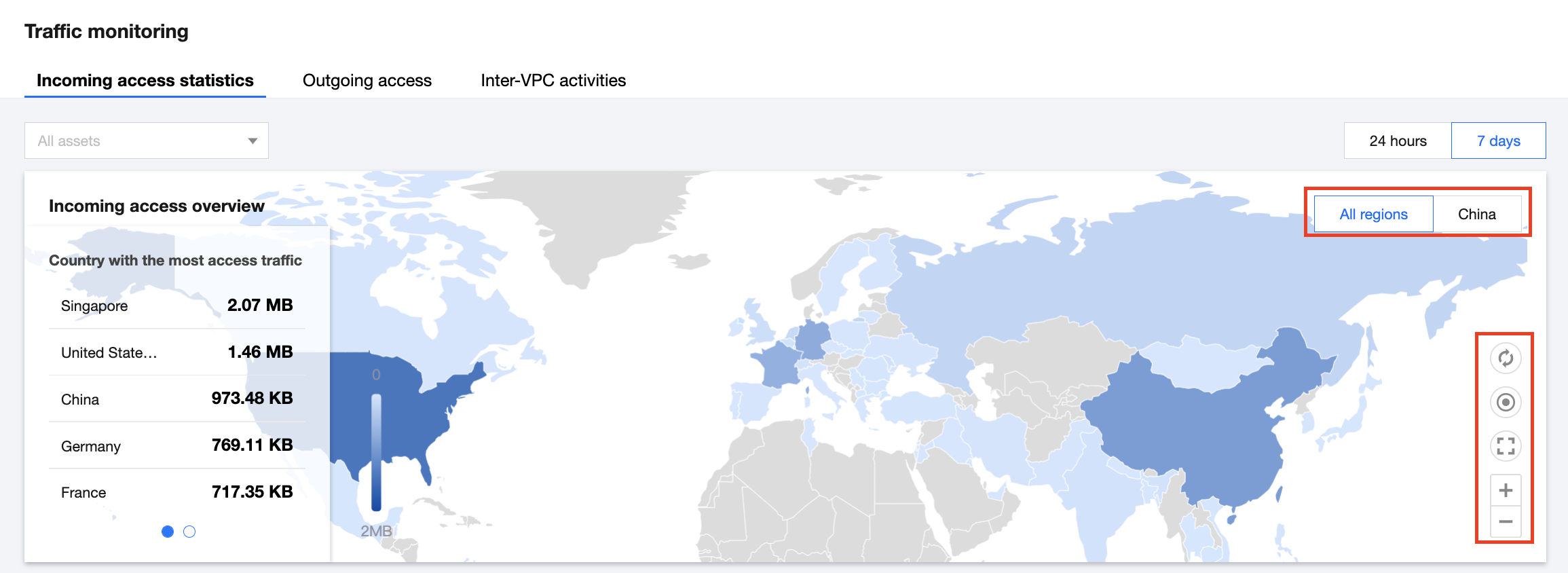 3. 在地图中查看世界和中国两个地域范围内的外部流量对资产的访问情况。