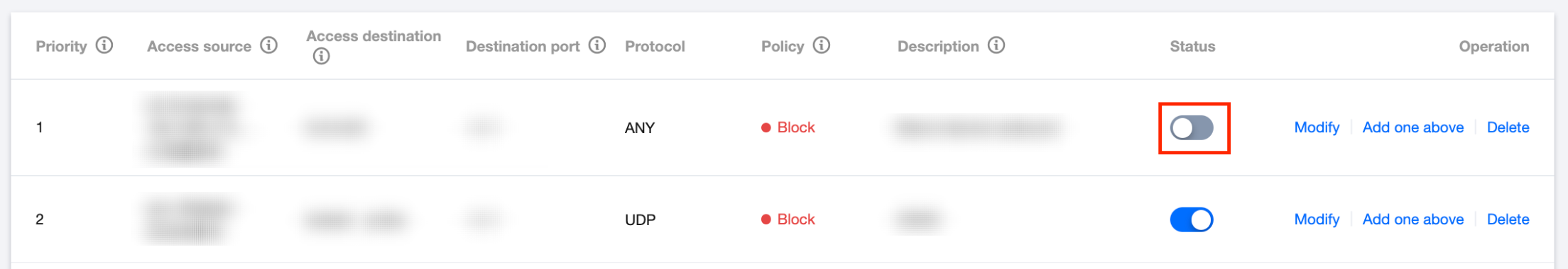 在 企业安全组页面,可以控制规则是否生效。若关闭开关,即停用规则,此规则不再参与规则匹配。