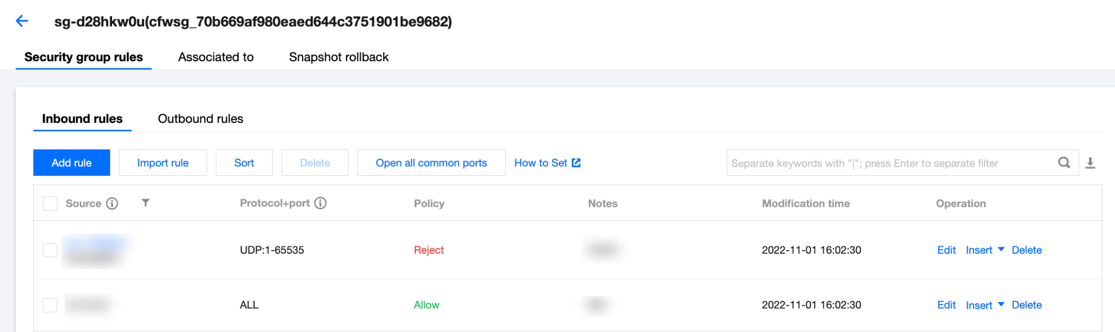 企业安全组规则完成设置后,在企业安全组页面可以对规则条目执行编辑、插入、删除操作、快速排序等操作。