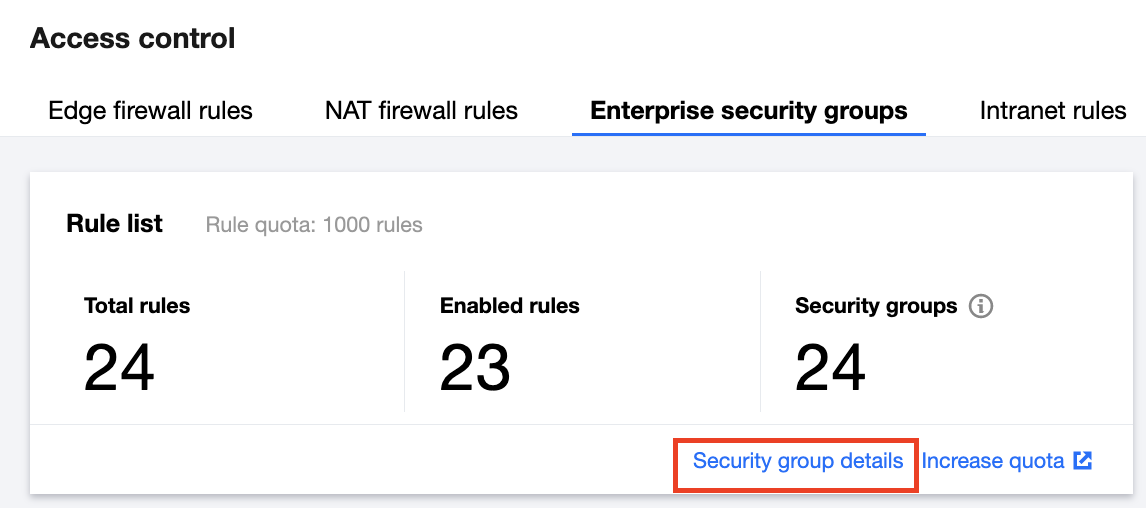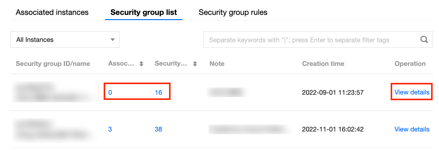 安全组列表:展示了当前地域的所有安全组列表、每个安全组关联的实例、安全组规则条目数、创建时间等。单击关联实例或安全组规则列的“数字”,可以跳转到单个实例所对应的安全组列表或安全组规则详情页面。单击查看详情,可跳转到私有网络控制台安全组详情页面。