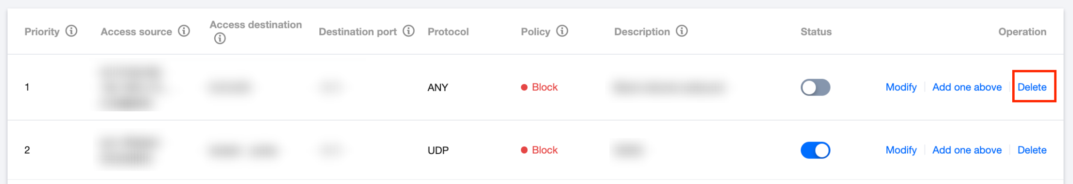 在 企业安全组页面,选择所需规则,单击删除,二次确认后,可以删除目标规则。