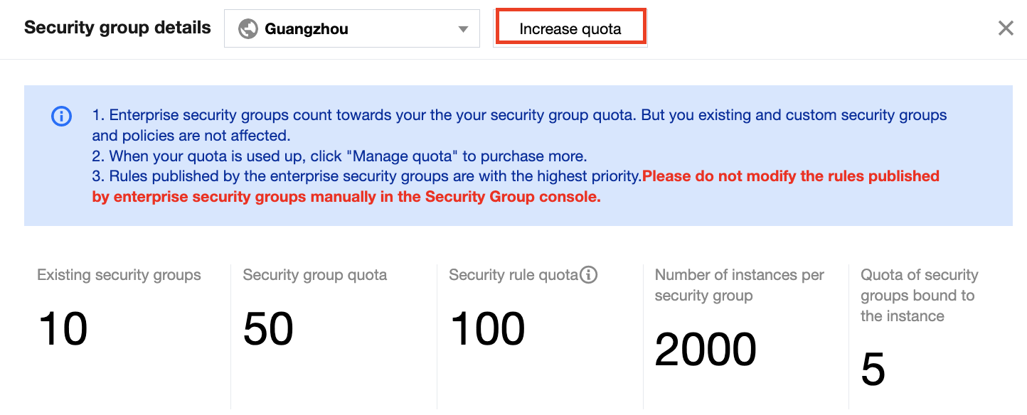 3. 在安全组可视化页面,可查看实例所在的地域和各种配额信息,安全组配额可以根据实际情况去扩容。