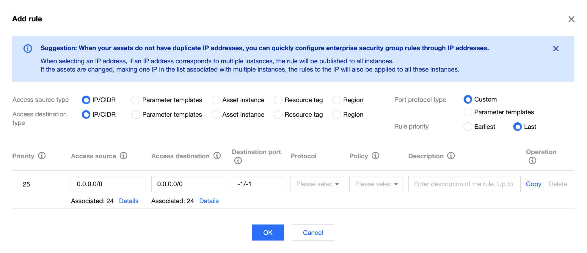 访问目的:跟访问源一样也支持 IP/CIDR、参数模板、资产实例、资产分组、资源标签、地域等类型。