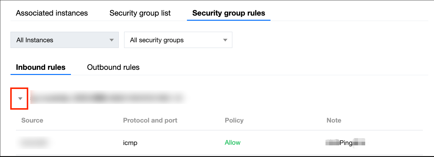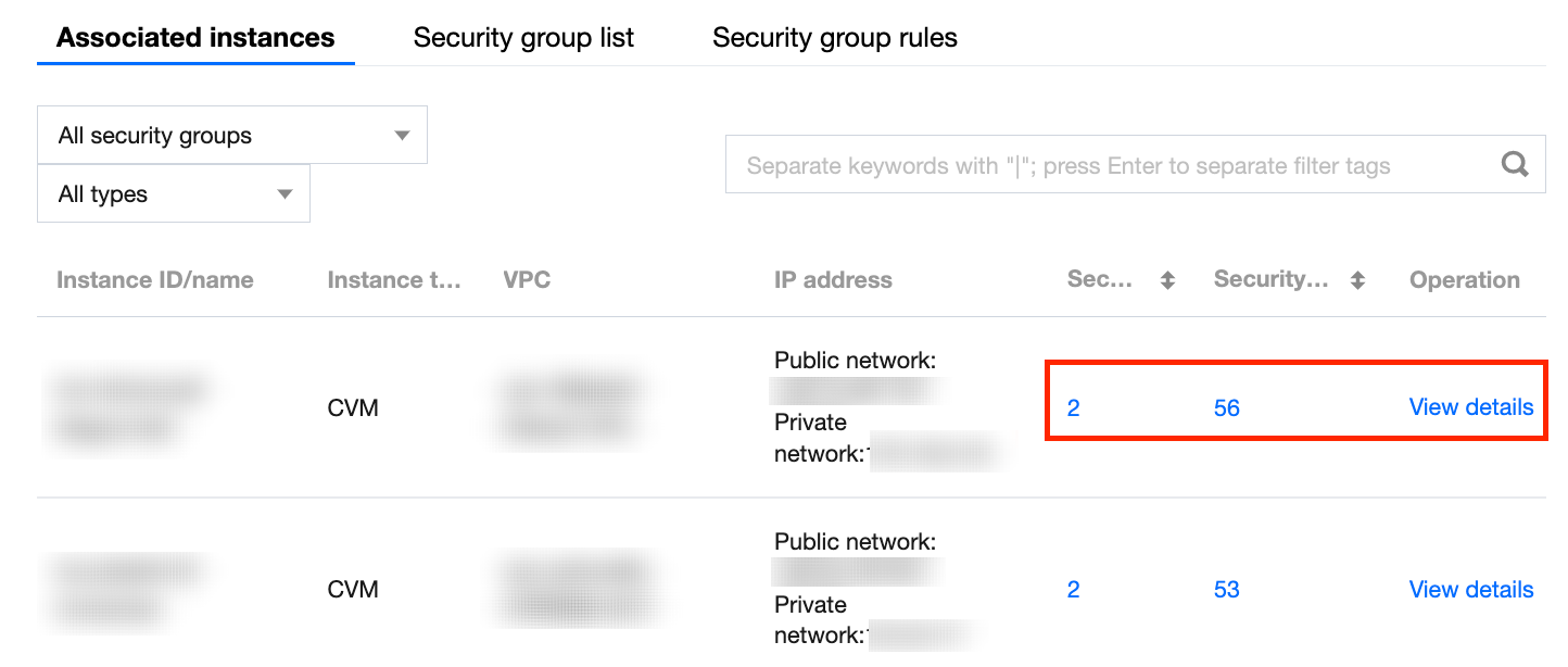 关联实例:展示当前某个地域所有的实例,包括实例名称、实例类型、所属网络、IP 地址等信息。单击安全组或安全组规则列的“数字”,可以跳转到单个实例所对应的安全组列表或安全组规则详情页面。单击查看详情可以跳转到实例的详情页面。