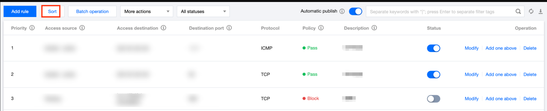 1. 在 企业安全组页面,单击快速排序,选择所需规则,点击鼠标左键拖拽至合适的位置。