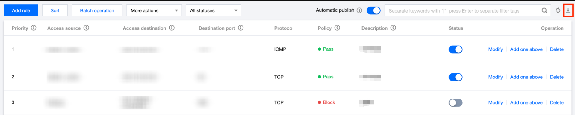 2. 调整完成后,单击保存,调整后的优先级即可生效,企业安全组会自动将新的规则优先级下发到实例。
