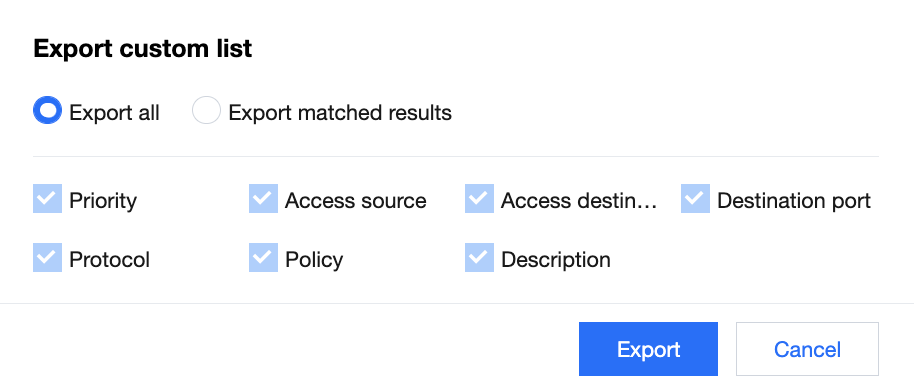1. 在 企业安全组页面,单击规则列表右上方的,弹出自定义列表导出窗口。