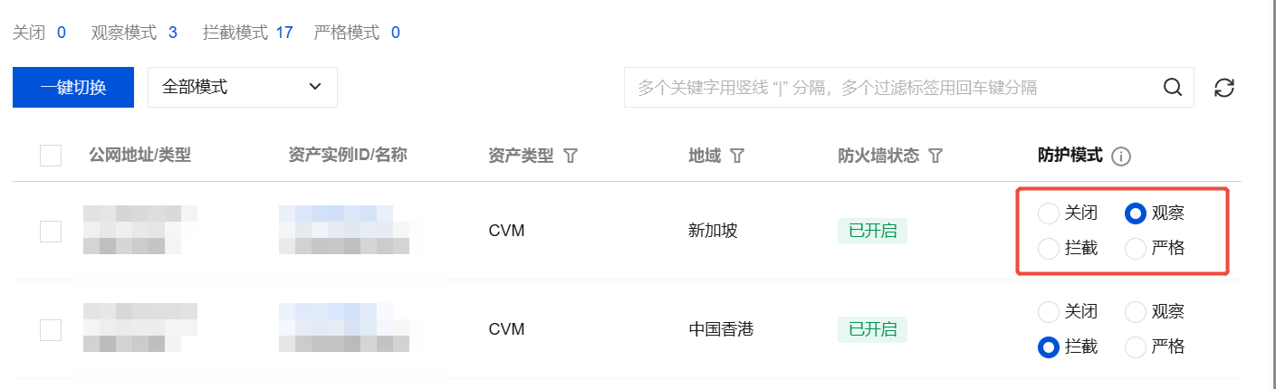 2. 在入侵防御页面,找到“防护模式”模块,进行防护模式设置,防护模式共分为观察模式、拦截模式及严格模式三种。
