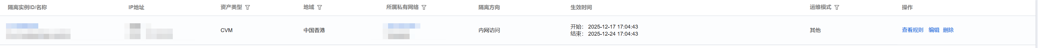 在隔离列表内,当某一个 IP 的生效时间到期后,列表会自动删除该 IP,此时该 IP 的安全组规则也会被删除。因此,为了避免已失陷的 IP 被自动移出隔离名单,可以在列表右侧操作栏,单击编辑,对需要操作的 IP 的终止时间和日期进行修改。