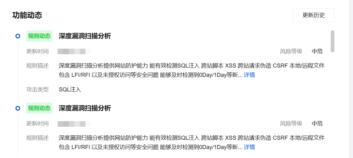 3. 单击更新历史,可查看详细的规则动态与漏洞动态记录。