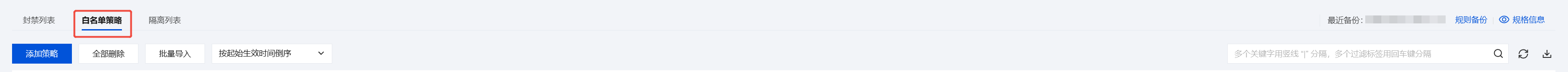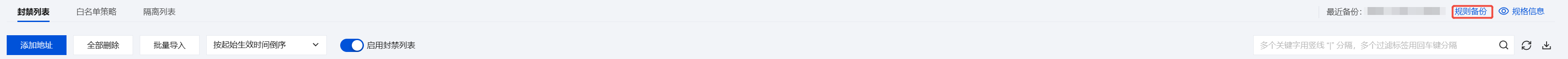 单击规则备份,即可将现有的封禁列表和白名单策略规则进行备份,同时当规则发生了很大的变化之后,单击备份文件右侧的回滚,即可将规则进行复原。