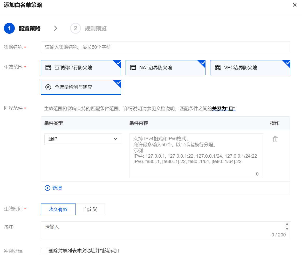 1. 在白名单策略页面,单击添加策略,进入配置策略界面,配置相关参数。 字段说明: