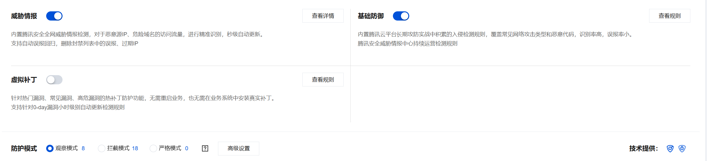 选择“观察模式”,威胁情报、基础防御、虚拟补丁均为检测模式,针对发现的恶意访问或网络攻击行为,只告警,不自动阻断连接。