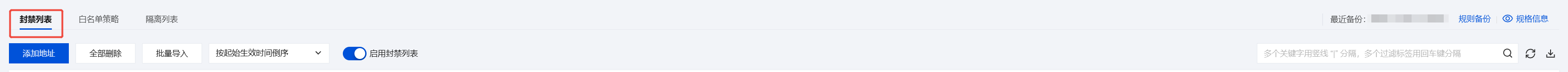 冲突处理:勾选“删除封禁列表冲突地址并继续添加”后,在执行添加操作遇到与封禁列表中存在冲突的地址时,系统会自动移除封禁列表中的冲突地址,并继续完成后续的添加任务。